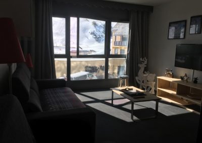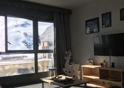 Salon avec 2 canapés, table basse et télé TNT, grande baie vitrée avec vue sur les pistes exposition Sud.